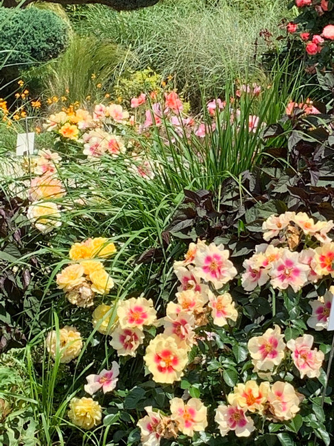 Foto oben rechts: Kombination der Persica Rose 'Eye of the Tiger' mit Gräsern, wie Rutenhirse (Panicum) und Braunblättriger Wasserdost (Eupatorium rugosum ‘Chocolate’ syn. Ageratina)